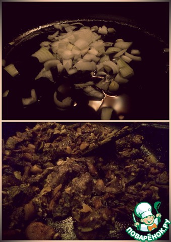 Поджарьте лук, чеснок и грибы до готовности. К ним добавьте соль и перец по вкусу.