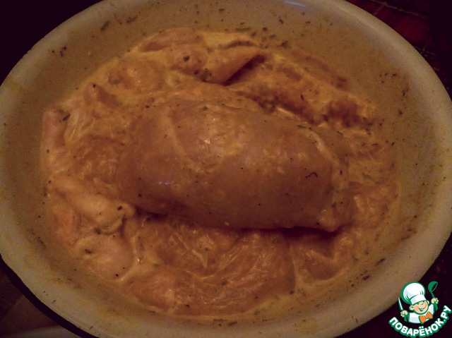 Замаринуйте филе курицы. Все пряности добавляются по вкусу. Оставьте мариноваться где-то на час, можно и по дольше (хоть на ночь).