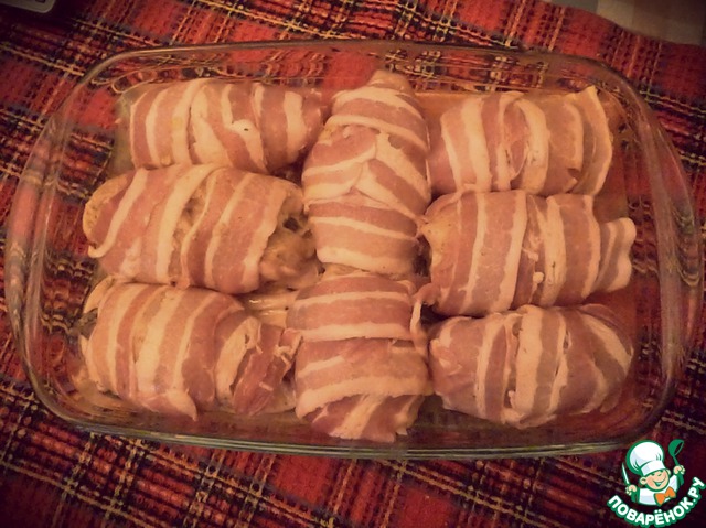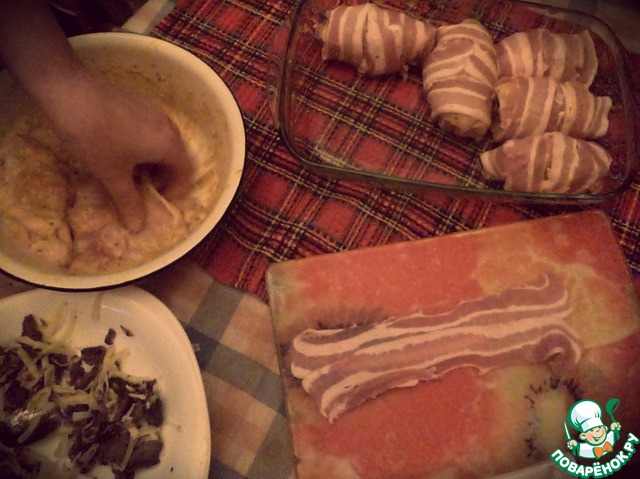 Рецепт «Куриные рулетики в беконе с грибами»: