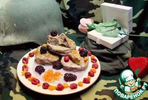 Блюдо получилось очень красочное и насыщенное. Сплочение множества фруктов не только приятно на вкус, но и насыщает организм массой полезных веществ. С праздником, дорогие защитники Отечества! Будьте здоровы!
