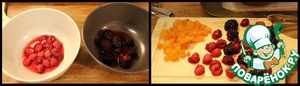В это время размораживаем ягодки по выбору (у меня - это малина и ежевика). Немного ягод откладываем к кураге для украшения.