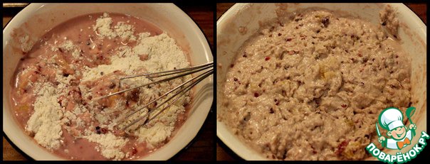 Готовую жидкую смесь выливаем в сухую смесь и перемешиваем. Сильно перемешивать не нужно. Достаточно будет добиться того, что не будет видно следа муки. Если перемешивать до однородного состояния, то оладушки не поднимутся и будут не воздушными.