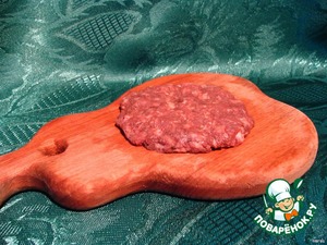 Лосятину посолить (0,5 чайной ложки) и добавить специй (майоран, паприка, мускатный орех) по вкусу и перемешать, добавив 0,5 стакана воды. Фарш разделить на 8 частей и из одной из них сформировать лепешку.
