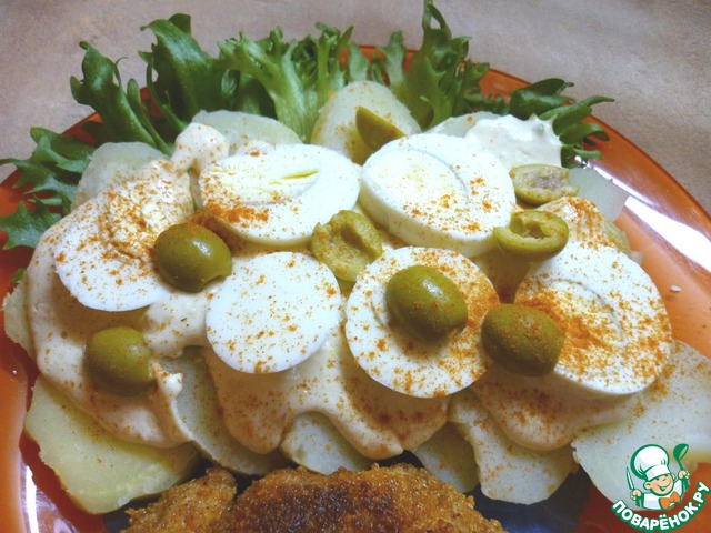 Нарезанный на кружочки картофель традиционно выкладывают на листья салата, поливают соусом, украшают отварным яйцом и оливками.