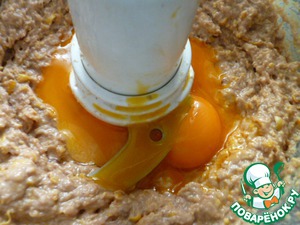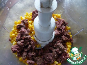 • Слить жидкость с кукурузы, лук слегка припустить на растительном масле ( 4 ст. л.). В миксере соединить кукурузу, лук с растительным маслом, в котором он жарился и мясной фарш. Измельчить в однородную массу.