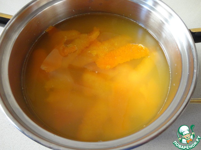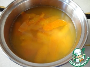 Минут за 15 до готовности кейка, начинаем делать сироп. В кастрюльку наливаем 300 г воды, 200 г апельсинового сока, 400 г сахара и тонкие пластины цедры 2-х апельсинов. Сироп доводим до кипения и даем ему покипеть минуты 4.