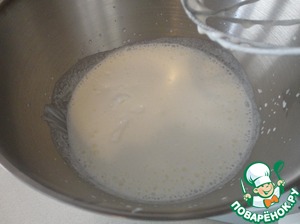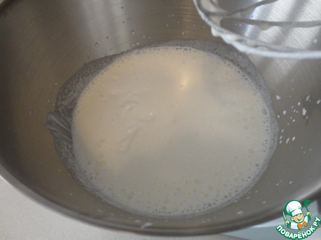 Взбиваем 400 г сливок. Когда сливки начнут загустевать, добавляем 400 г йогурта. Взбиваем до консистенции взбитых сливок.
