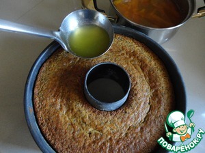 Готовый горячий кейк пропитываем горячим сиропом. Накрываем его или ставим в контейнер для тортов и оставляем до полного остывания.