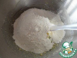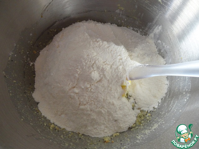 В последнюю очередь добавляем муку с разрыхлителем. Тщательно, но аккуратно перемешиваем.