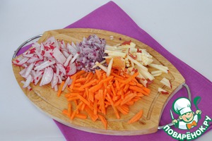 Порежу соломкой все овощи. Помидоры черри режу на 4 части.