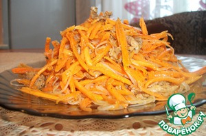 • Мясо порезать тонкой соломкой, лук мелко порубить. На раскалённую сковороду налить немного растительного масла. Закинуть мясо, обжарить (мясо готовится очень быстро). Снять, остудить, добавить к моркови.
