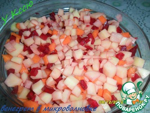 Сырые овощи: морковь, картофель, свеклу режем кубиками, помещаем в миску-кастрюльку (для микроволновки), присаливаем по вкусу, накрываем крышкой или тарелкой и ставим в микроволновку на 10 мин. на самую большую мощность (у меня 900).