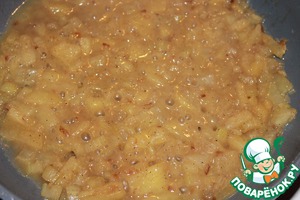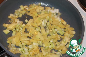 Лук мелко режем, поджариваем на оливковом масле. Картофель чистим, мелко режем, отправляем к луку, добавляем мелко порезанный сельдерей. Чуть обжариваем, но не румяним.