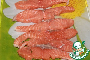 Семгу освобождаем от кожи и костей, режем тоненькими пластиками (НЕ СОЛИМ И НЕ ПЕРЧИМ!!!). Соль даст бекон.