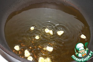 Разогреваем оливковое масло, кидаем в него порезанный пластинками чеснок, чуть обжариваем и убираем.