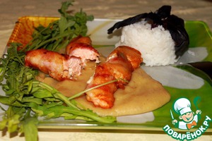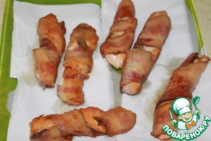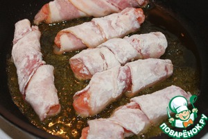 Скручиваем рулетиками и оборачиваем пластинками бекона.