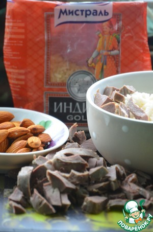 Разогреть раст. масло и немного обжарить в нем часть миндаля. Соединить обжаренный миндаль, сердце, рис, добавить соль, перец по вкусу.