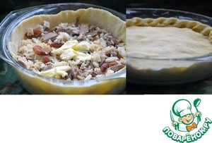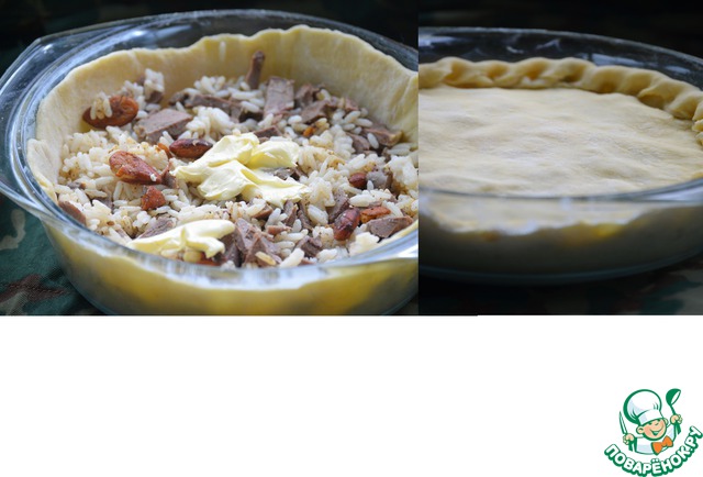 Тесто разделить на две части: большую и меньшую. Большую часть тонко раскатать в большой круг, уложить его в форму поверх миндаля. Равномерно распределить рис, сверху положить сливочное масло и закрыть второй частью раскатанного теста.