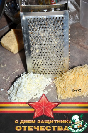 • Сыр и варёное яйцо натираю на мелкой тёрке, и к грибам.