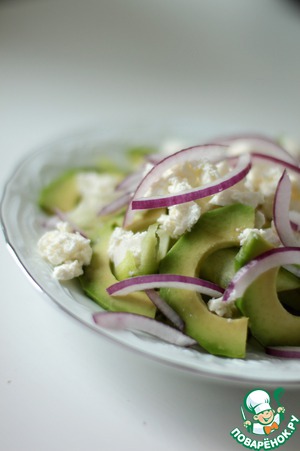 Нарежем авокадо тонкими полосками, красный лук полукольцами, покрошим фету.
