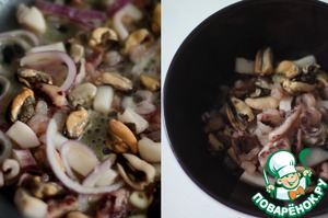 Для горячего нужно разморозить морепродукты. На сковороде поджарить лук, чеснок и морепродукты.