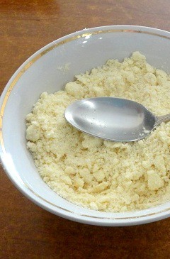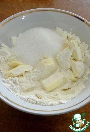 В муке порубить масло, добавить соль, сахар - 3 ст. л.