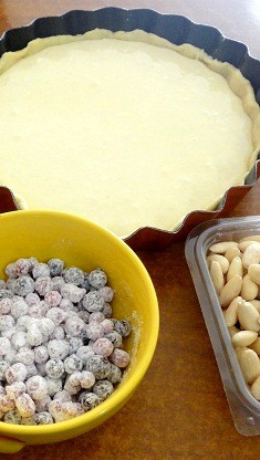 Ягоды (у меня замороженные красная и черная смородина) перемешать с крахмалом. Так они лучше сохраняются в выпечке и не потекут. Приготовить миндаль (желательно очищенный.