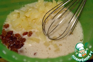 Добавить помытый изюм, ананасы, растопленное сливочное масло. Перемешать.