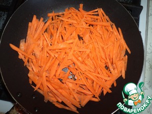 В сковороду наливаем оливковое или растительное масло, разогреваем, выкладываем морковь.