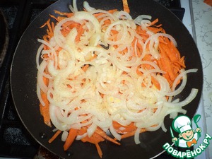 Обжарив морковь, добавляем нарезанный лук полукольцами.