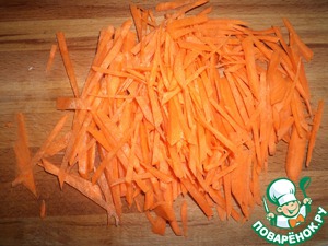 Пока наш рулет выпекается, делаем гарнир. Нарезаем соломкой оставшуюся морковь.