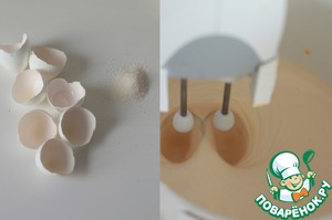 Готовим классический шоколадный бисквит. Взбиваем яйца, сахар и горячую воду 10 минут.
