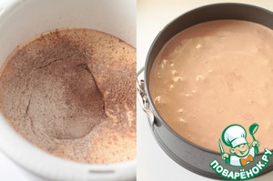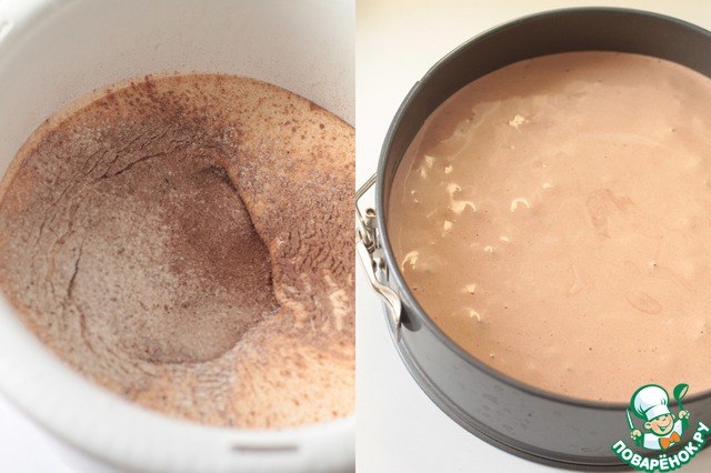 Соединяем какао, муку и разрыхлитель и просеиваем в тесто. Буквально пару раз пройдемся миксером, чтобы масса объединилась.