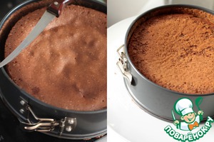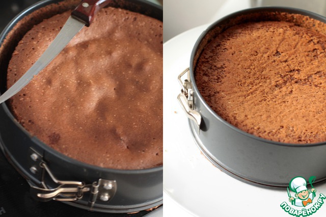 Готовый бисквит достаем, остужаем, даем немного отдохнуть и острым ножом проходимся по краям, чтобы бисквит не потрескался. Переворачиваем его на тарелку, оставляем в форме и отправляем остужаться.