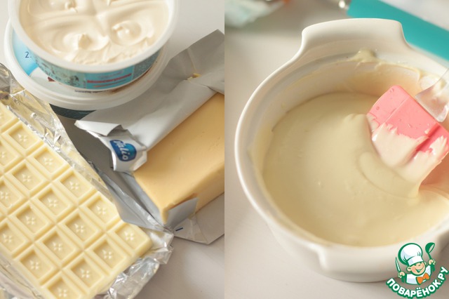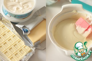 Для базового крема нам нужно соединить белый шоколад, сливочный сыр, масло и немного лимонного сока. Для начала надо растопить шоколад на водяной бане или в микроволновке.