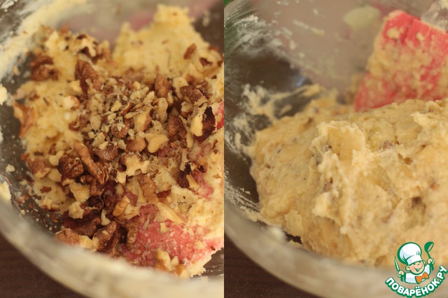 Бананы измельчаем в блендере, я предпочитаю оставлять маленькие кусочки, так, на мой вкус, пикантней. Добавляем бананы в 1/3 крема, введем туда же грецкие орехи. Все перемешаем. -