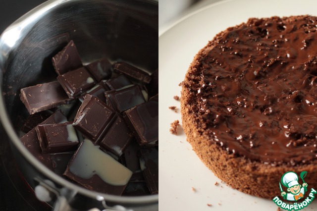 Остывший бисквит разрежем пополам и намажем нижнюю часть шоколадным ганашем. Отправим в холодильник, чтобы шоколад застыл, тогда он будет хрустящий. -