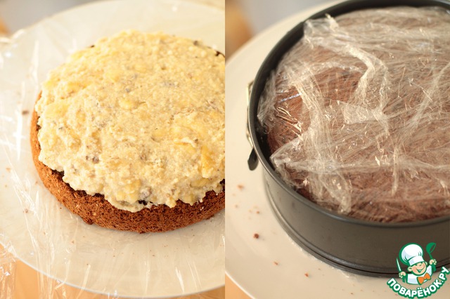 Достанем наш торт и крем. Под бисквит я постелила пищевую пленку, чтобы крем не растекся. На шоколад выложим бананово-ореховый крем и закроем второй половиной бисквита. И снова отправляем в холодильник минут на 30-40. Я, для верности, еще кольцо от формы надела :)