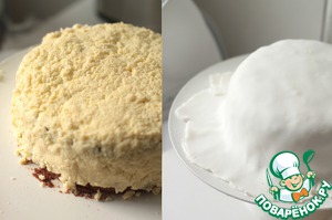 Ну, и последний шаг - если вы будете укладывать сверху мастику, то аккуратно разровняйте 2/3 охлажденного крема по всей поверхности тортика. На рабочем столе насыпьте муку или сахарную пудру, раскатайте мастику в форме круга и уложите сверху на торт.