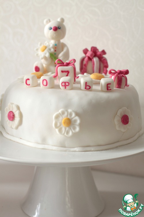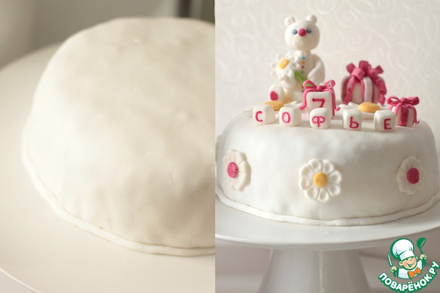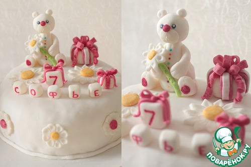 Украшения для тортика я делала заранее, поэтому, простите, пошаговых фото не будет, т. к. я смотрела мастер-класс у девочки на сайте, где она описывает каждый шажок создания мишки. Если кому-то понадобится, не стесняйтесь, пишите в коментах или в личку, я пришлю ссылку. Просто она настолько подробно все расписывает, что я точно так не повторю :) Напишу только, что излишки мастики мы обрезаем тонким ножом, скручиваем из них жгутики и укладываем внизу, чтобы закрыть стык с тортиком. Расставляем наши фигурки и отправляем в холодильник.