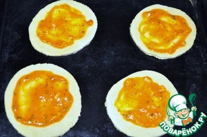 Раскатываю шарики на лепешки и вырезаю по блюдцу круги, наношу соус.