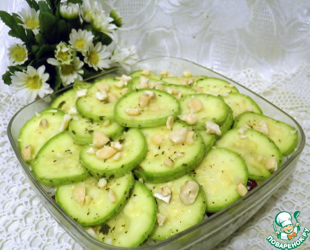 Выложить на тарелку, сверху - кружочки подпеченного цуккини. Полить заправкой. Зелень не повредит.