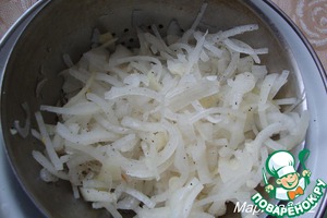 Лук порезать соломкой и залить кипятком минут на 5. Слить кипяток и залить холодной водой.