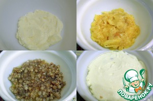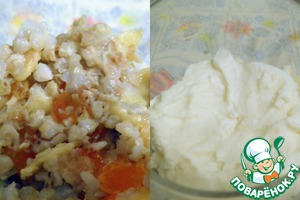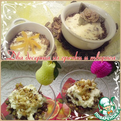 Займемся приготовлением. На дно порционных форм для запекания выкладываем слоями творожный крем, яблочное пюре и сахарную гречневую массу. Верхний слой опять творожный крем. В противень наливаем воды так, чтобы она доходила до середины формочки и отправляем в разогретую до 170С духовку на 30-40 минут до образования румяной корочки.