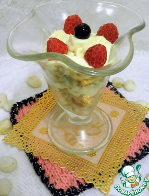 Последним слоем опять является крем, который для красоты можно выложить из кулинарного конверта или шприца, и украшаем свежими или замороженными ягодами.