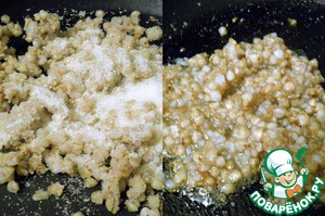 Приступим к приготовлению первого десерта. Для этого гречку (2ст. л.) обжарим на сухой сковороде с сахаром (1ст. л.) до растворения последнего.