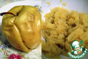 Яблоко запечем в духовке или микроволновке до мягкости (в микроволновке - 5 минут на полной мощности), очистить и размять в пюре. Кусочек имбиря очистить, натереть на терке. Смешать яблочное пюре, имбирь и корицу.