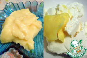 Крем для обоих десертов будет одинаковый. Для его приготовления смешаем мягкий творог (если у вас обычный, то предварительно протрите через сито) с кремом (4ст. л.).