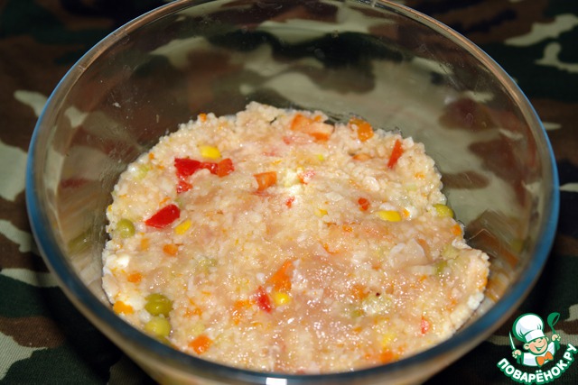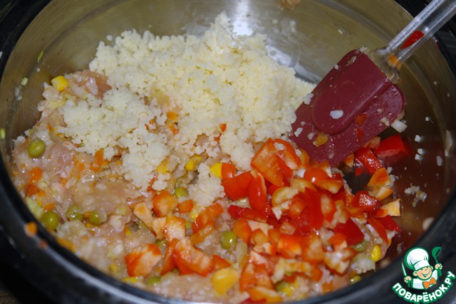 У меня осталось немного подготовленного фарша, я добавила в него 1 ст. ложку нарезанного болгарского перца и 2 ст. ложки пропаренного кус-куса. Перемешала. -