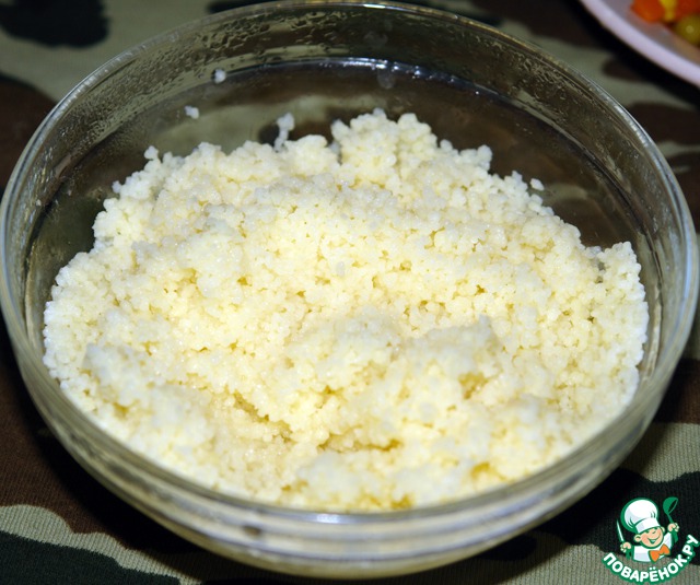 Кус-кус подготовить согласно инструкции на упаковке. То есть на 4 ложки кус-куса потребуется примерно 1 стакан воды. Заливаем кус-кус кипятком и дает настояться 10 мин., перемешать вилкой.